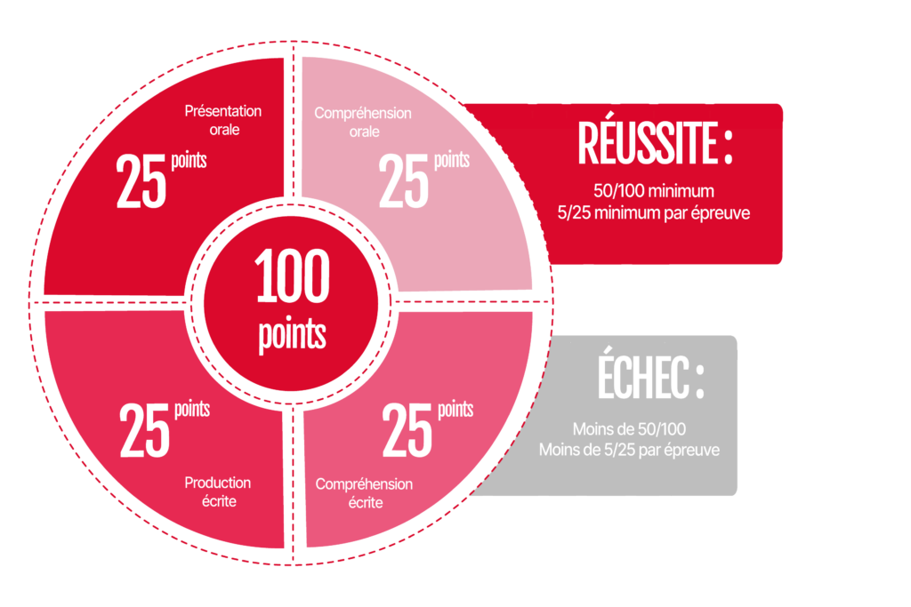 • Para aprobar: 50/100, sin obtener menos de 5/25 en cada prueba